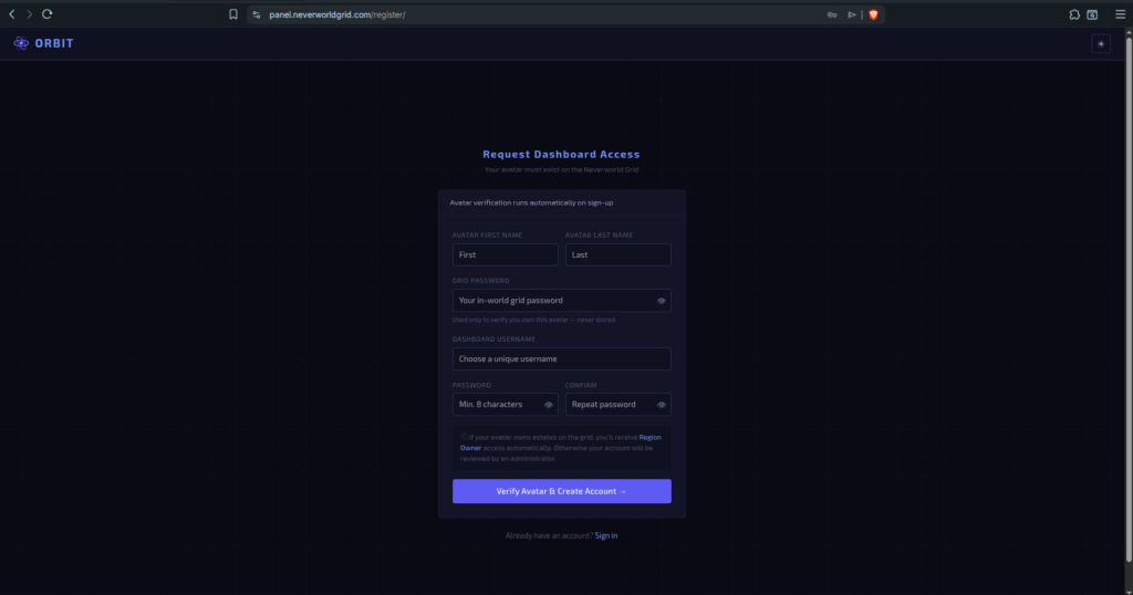 Sign-Up is easy, just follow the instructions. You will need your Avatar Name EXACTLY as it is in-world on your Region Owner’s Avatar, your in-world Password – a one-time verification, this information is not stored on the server, create yourself an Orbit username and password that is NOT your grid credentials.