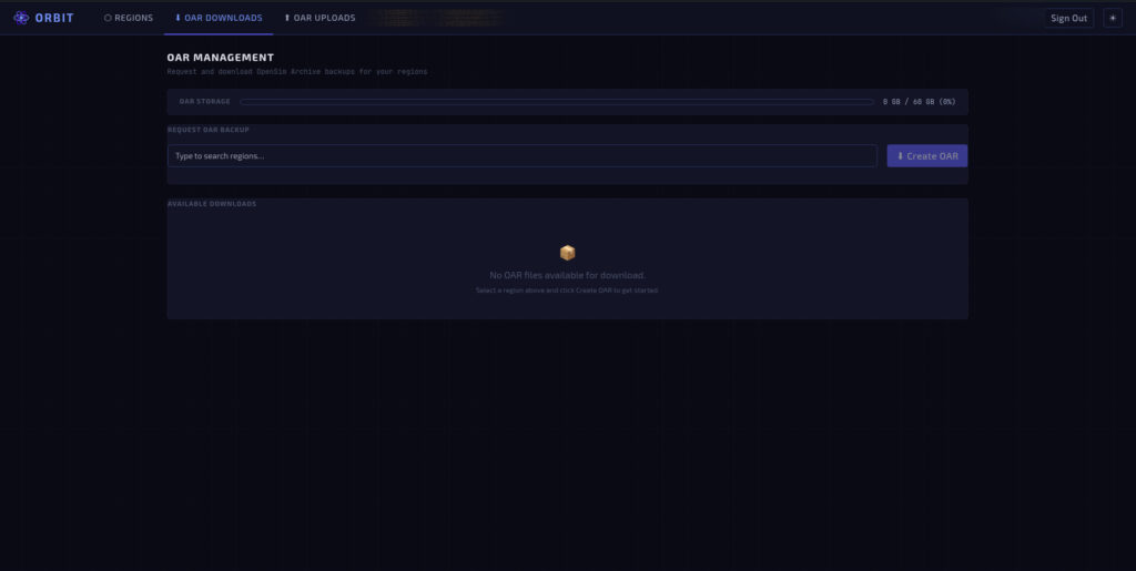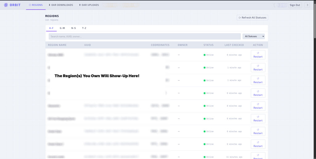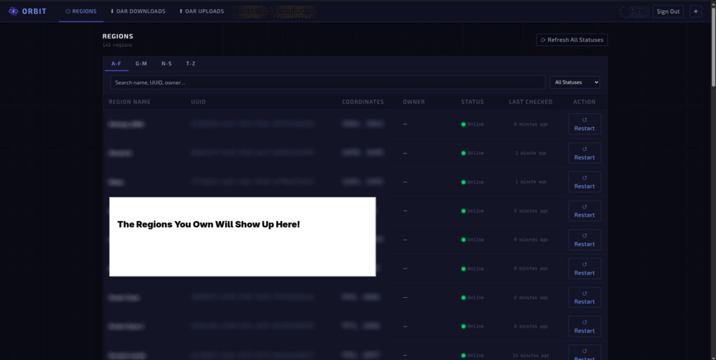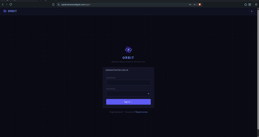 Neverworld Grid is proud to announce the latest tool for our Residents. The Region Management Dashboard – ORBIT – “Opensim Region Board & Interface Tool” where Region Owners can monitor their region status, manage Restarts, Download an OAR backup, and Upload an OAR file to their Region to overwrite the current content.