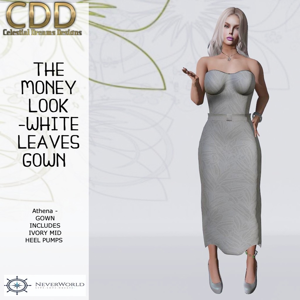 A beautiful sexy but demure gown with a light neutral design of white leaves against ecru fabric. Form-fitting and sized for Athena bodies.