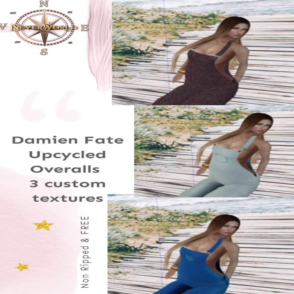 Upcycled Damien Fate overalls in several patterns. Rigged and fits most women of average size, alphas may be necessary.