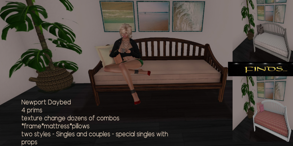 The Newport Daybed is a special product that has texture changes for the mattress, pillows and bed frame, and avsitter animations with props. At only 4 prims and narrow, this bed can be used in many applications around your home. The styling is casual.
