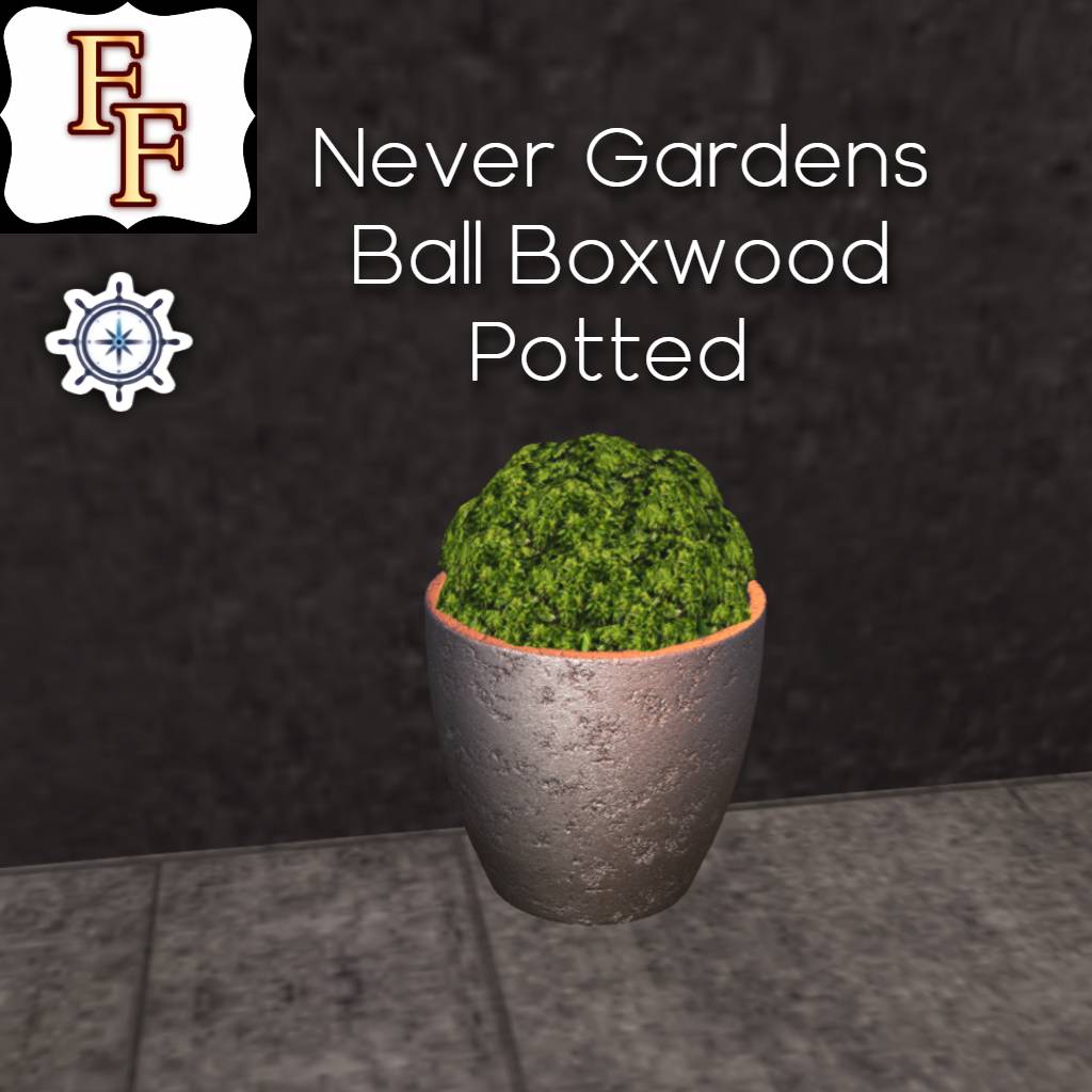 Just 3 prims and easily resizeable, this ball boxwood is potted in a cement, terra-tinted, deep pot, suitable for pathways, patios, and decks.