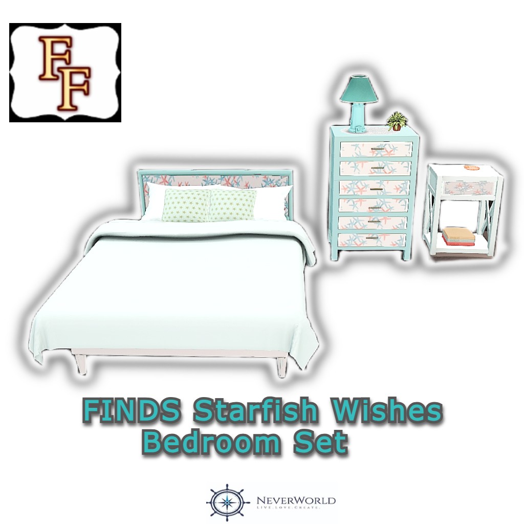 A lovely bedroom—shabby chic nautical colors—includes a double bed with sleeping animations, a chest of drawers, and a night table with accessories. The perfect little bedroom set for your beachhouse.