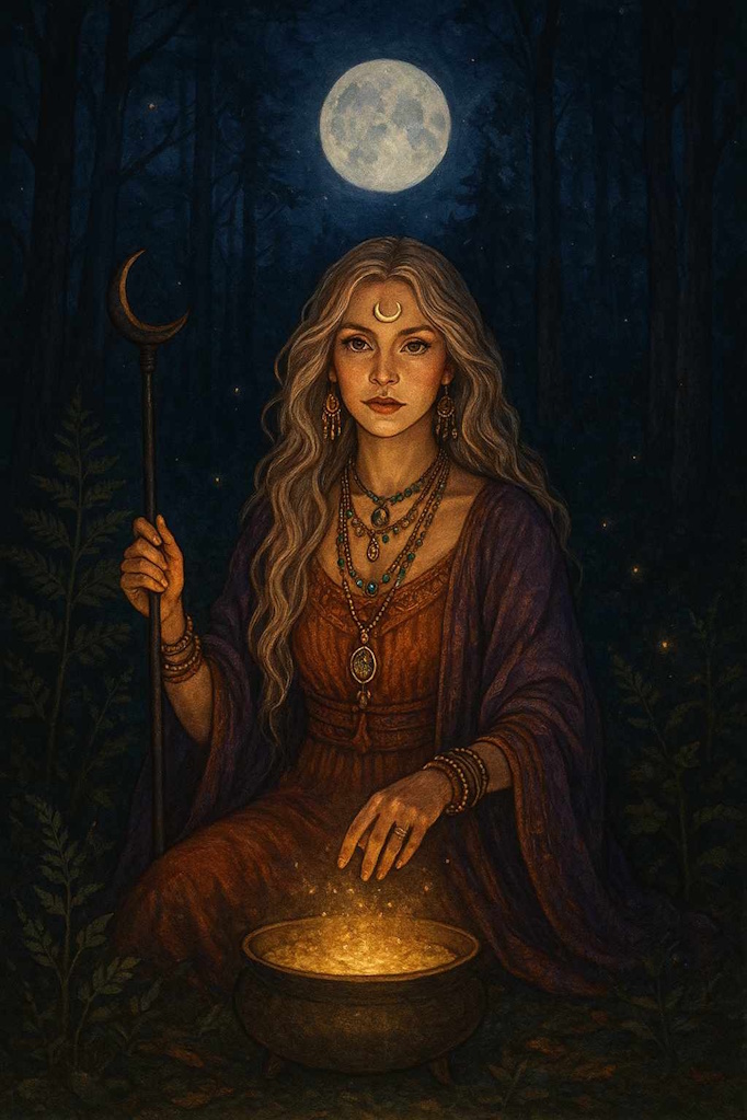 Hippie, Pagan, Priestess,Sitting in the moonlight holding a staff.