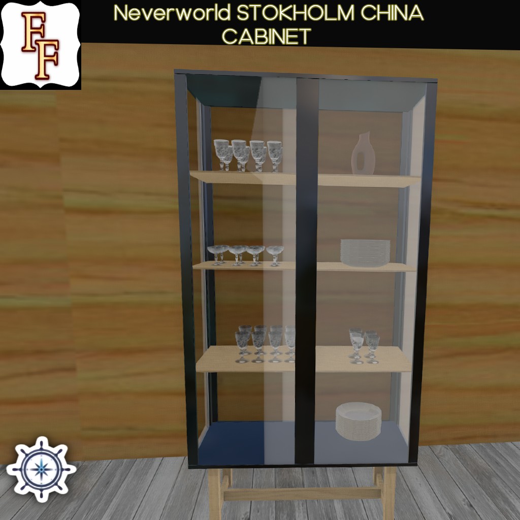Scandanavian style modern glass and ash wood china cabinet filled with dinnerware.