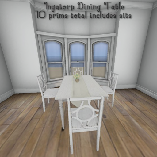 Scandi-designed dining table is superlight in feel and Land Impact Seats four, 10 prims total with sit animations.