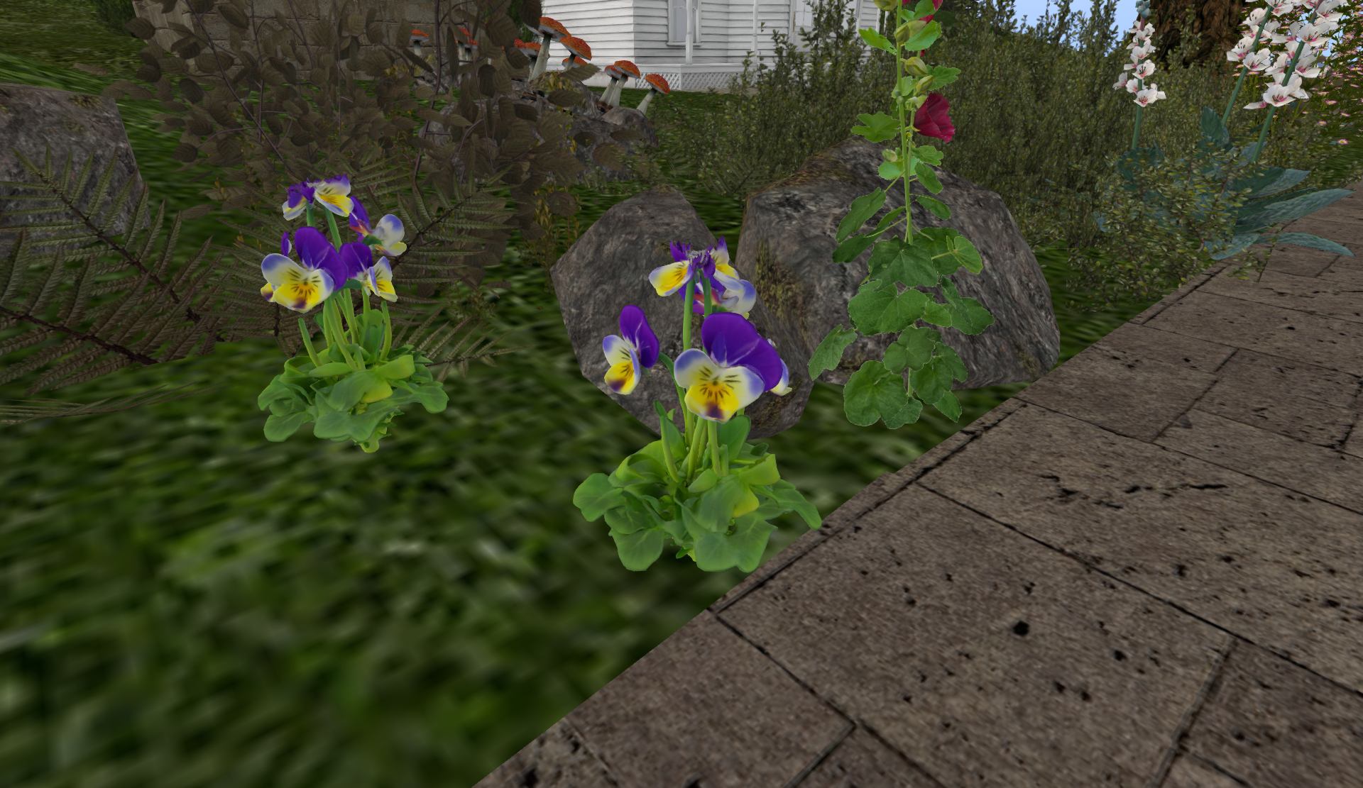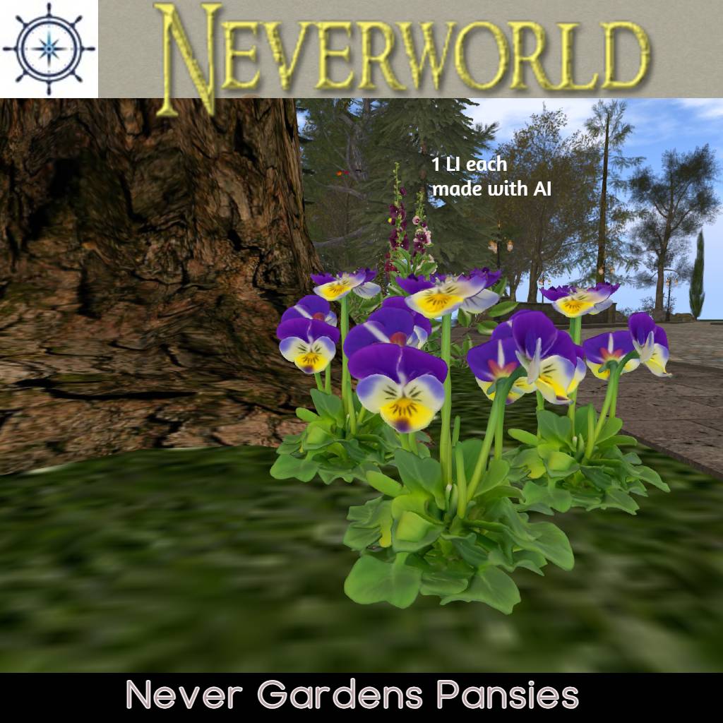 Made with AI, this detailed clump of pansies is only 1 Land Impact and is a pretty and bright accent piece for your garden. Easy to duplicate and resize. Look for more Never Gardens products soon. (Picture shows three pansies)