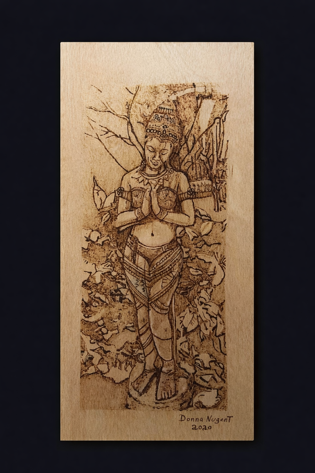 Pyrography hand burned by Me for Mourning Wood & Which Crafts. Indian Garden Statue.My photography skill being what they are, I did use ChatGPT to straighten the photo for use and add black boarder. Beautiful framed. Aloo included Texture in contents for more versatility.