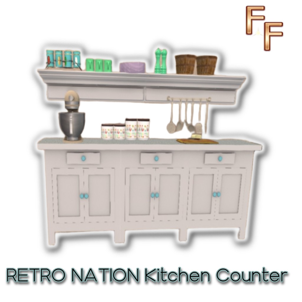 This is a really sweet little 50’s ’50s-inspired counter for your cottage. Includes animations, canister set, mixer, canned goods, plates, S&P in jadeite, utensils, mugs, and cutting board. 25 prims for the entire countertop and goods.